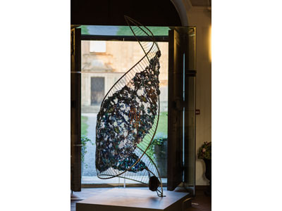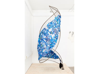 Die Skulptur ist ein taktiler, intimer Klangraum, dimensioniert für eine Person, und lädt ein sie zu betreten und zu berühren. Sie reagiert.